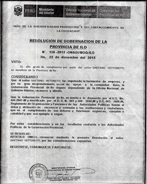 La resolución indica que “considerando que el Señor Gaetano Vettoretti, ha impulsado la formación de empresa, y por su gran desprendimiento social de apoyo a la comunidad ileña, la Gobernación Provincial de Ilo, órgano dependiente de la Oficina Nacional de Gobierno Interior, lo reconoce y alienta”.