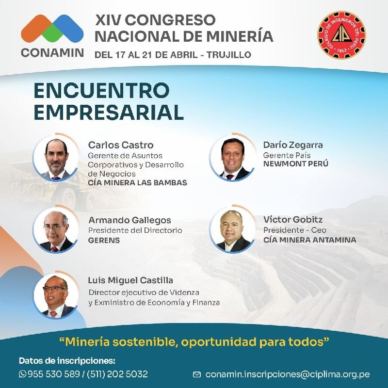 Antes de la clausura del Congreso Nacional de Minería – CONAMIN 2023, el 21 de abril se celebrará el Encuentro Empresarial, evento en el que comparten los ejecutivos de alto nivel de las compañías mineras más importantes, así como especialistas y personalidades del sector. El espacio tiene por objetivo debatir y reflexionar sobre el “desarrollo territorial y los proyectos mineros”.