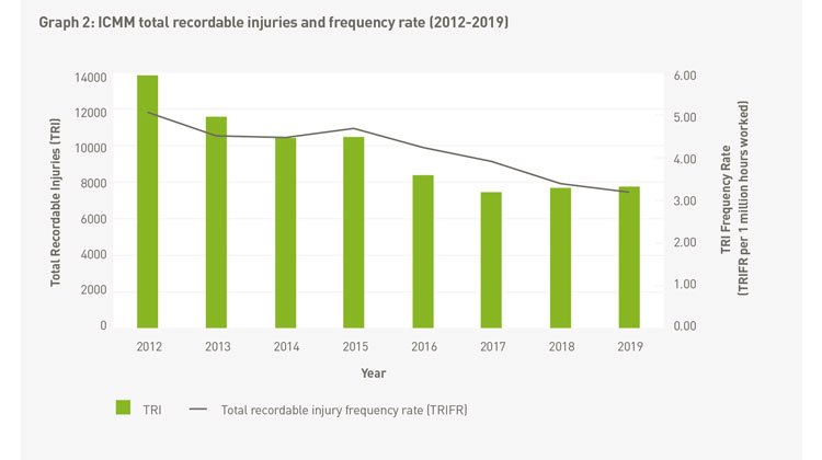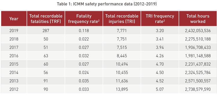 Las compañías mineras, miembros del International Council on Mining and Metals (ICMM), reportan sus datos de seguridad anualmente a partir de un enfoque común diseñado por la institución. ICMM compila y analiza la información proporcionada y la divulga públicamente para compartir el progreso y acelerar el aprendizaje en toda la industria.