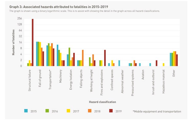 El gráfico 3 muestra que se produjo el mayor número de accidentes con muerte en 2019 a través de «falla estructural«. Todas estas muertes fueron como resultado de la del colapso de la presa de Brumadinho.