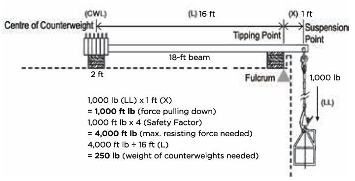 Multiplique la carga de los contrapesos por la distancia de la viga estabilizadora desde el punto de apoyo hasta el centro de los contrapesos (L). Dicho número debe ser al menos cuatro veces mayor que la distancia de la viga voladiza desde el fulcro hasta el punto de suspensión (X) multiplicada por la capacidad del equipo suspendido.