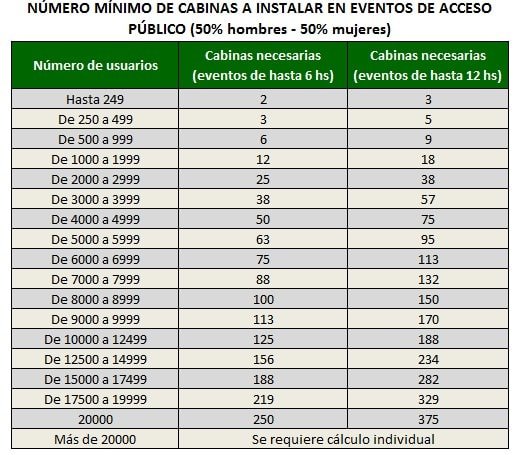 Establece que la distancia máxima entre cada puesto de trabajo y el baño no debe superar los 100 metros y que, si la obra de construcción cuenta con varias plantas, se disponga al menos de un baño cada dos plantas. Para los eventos públicos, la norma incorpora la tabla de la asociación estadounidense PSAI (Portable Sanitation Associated International) que determina la cantidad mínima de sanitarios a disponerse en base a la cantidad de usuarios prevista y a la duración del evento.
