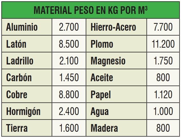 La tabla siguiente indica los pesos por m3 de los diversos materiales a tener en cuenta en las operaciones de elevación de cargas: