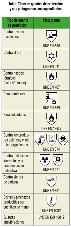 La mayoría de las normas europeas relativas a guantes de protección indican que estos deben ir marcados con un pictograma con forma de escudo en cuyo interior se encuentra el símbolo correspondiente al tipo de riesgo frente al cual protege. El símbolo de protección junto con la referencia a un número de norma implica una lista de niveles de prestación obtenidos en uno o varios ensayos de laboratorio.