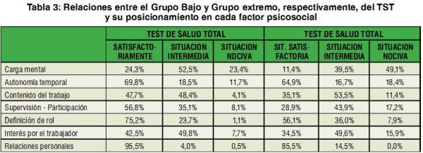 En la tabla 3 podemos comprobar que a mejor situación, expresada en puntuaciones directas T ≤ 4, mejor situación en los distintos factores medidos por el método CNCT. Igualmente, a peor situación en el TST (T ≥ 8) más nociva en los factores psicosociales. Relaciones entre el Grupo bajo y Grupo extremo, respectivamente, del TST y su posicionamiento en cada factor psicosocial.