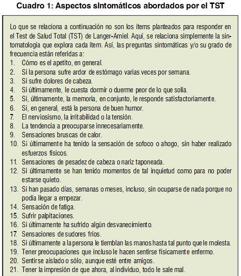 El TST, desde la exploración sintomática, está relacionado con el momento de su utilización y refleja posible sintomatología depresivoneurótica. No así psicótica, por ejemplo. No es un test que valora la salud mental de la persona, pero sí nos habla de ella en cuanto valora, a través de la sintomatología descrita, situaciones de sufrimiento por encima de lo que es normal o deseable.