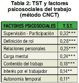 En diversos estudios llevados a cabo por el Centro Nacional de Condiciones de Trabajo (CNCT) se han encontrado correlaciones significativas entre el TST y diferentes aspectos psicosociales del trabajo, medidos según el método de evaluación de factores psicosociales elaborado por técnicos del CNCT. Este método estudia siete factores psicosociales del entorno laboral, resultando que se da una mayor puntuación T cuanto peor o más nociva es la situación de los factores psicosociales (tabla 2).