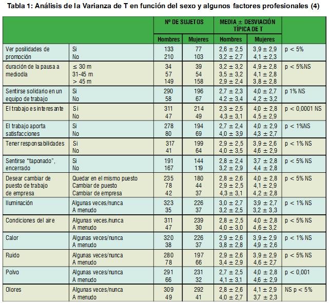 La puntuación T no variaba significativamente con la antigüedad en la empresa, la efectividad del equipo, la clase de horarios de trabajo, la postura de trabajo, carga física y duración del trayecto domicilio trabajo. Algún estudio español corrobora alguno de estos aspectos, por ejemplo en lo referente a la variable antigüedad.